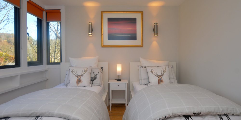 - Comfortable Bedrooms: Boasts two spacious bedrooms - a double bedroom with an ensuite, and a large patio balcony with spectacular sea views. The second bedroom is on the upper floor, a twin bedroom with views out over the rear woodland garden. All rooms are furnished with quality linens, and storage space. The family bathroom features a shower cubicle, hand basin, and toilet