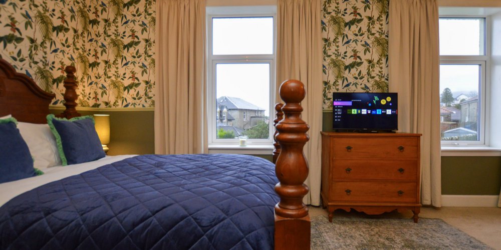 King Double Bedroom - Features a romantic four‑poster bed, Smart TV, Ensuite bathroom.