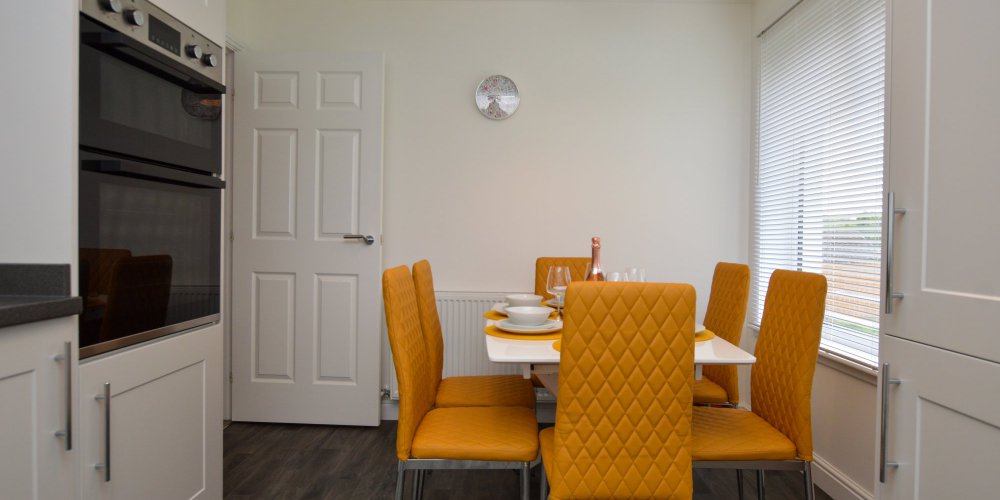 Kitchen: With electric oven, electric hob, dishwasher, microwave, fridge/freezer and dining table.