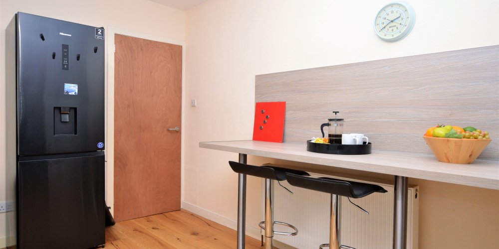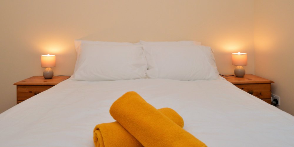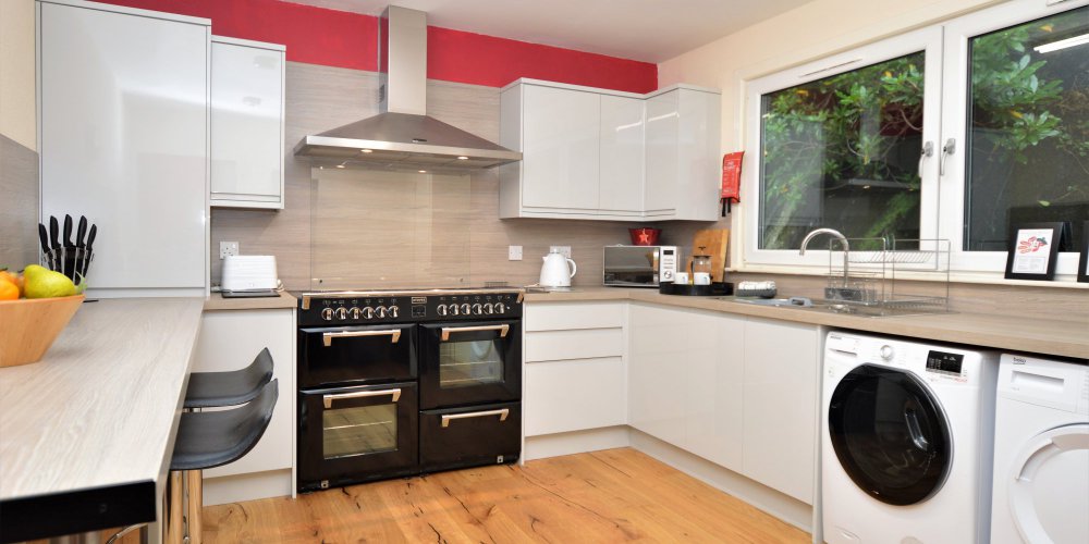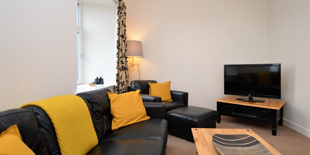 The spacious living room features comfortable sofas, central heating and large window views to maximise the breath-taking sea views. A lovely room to enjoy cosy nights in after a day exploring. For entertainment there is a Smart TV with Freeview and Wi-Fi.