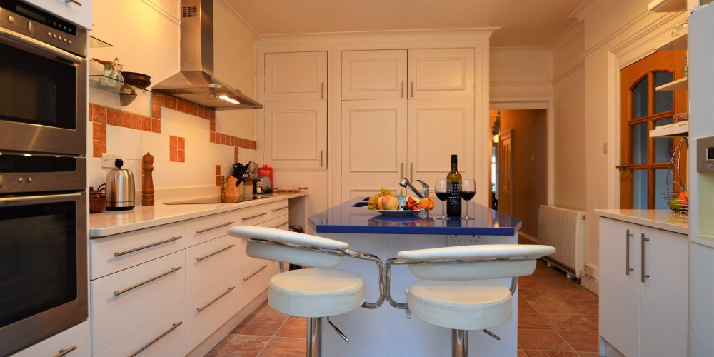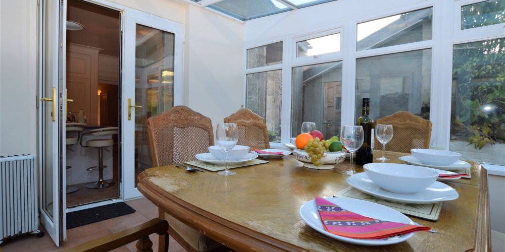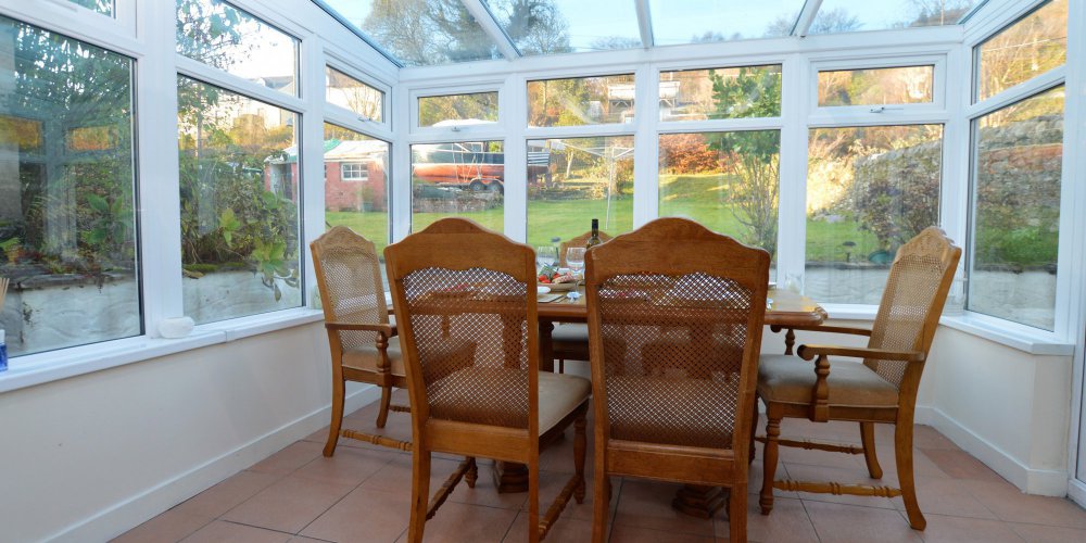 The inviting living room is spacious and bright with floor-to-ceiling windows to enjoy the spectacular sea views and beyond. Featuring a wood burner for cosy nights and comfortable sofas, a wonderful room to sit back and relax with a glass of wine enjoying the ever-changing views. The kitchen is modern and very well equipped, complete with breakfast bar, electric cooker, hob, microwave, dishwasher and fridge/freezer. From the kitchen there is a wonderful conservatory overlooking the garden. This is used as the dining room.