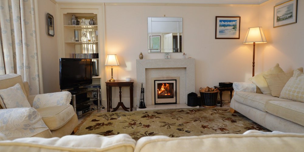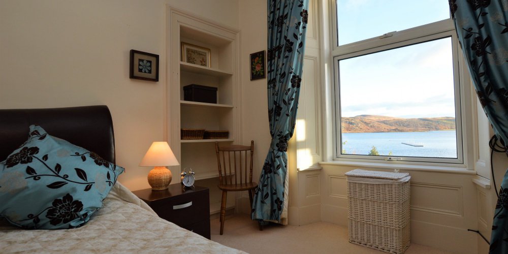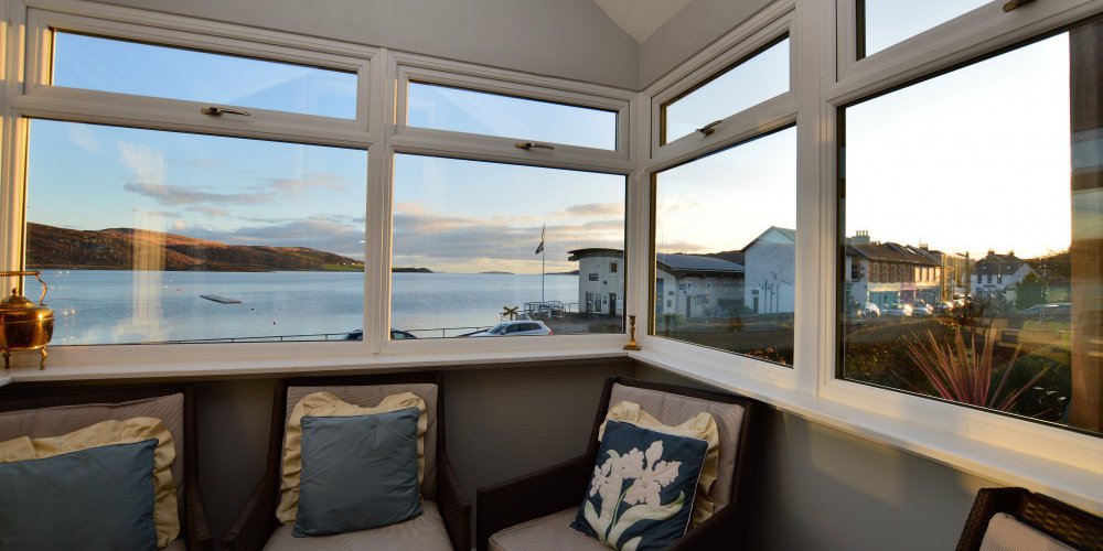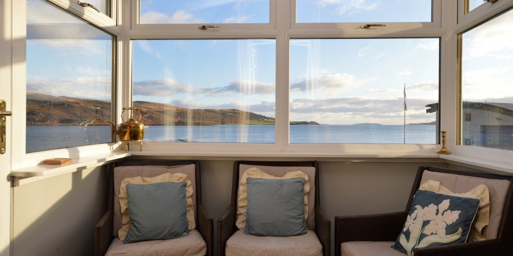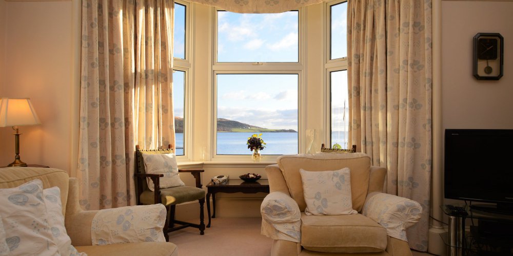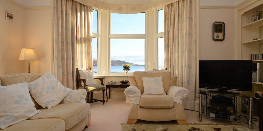 The living room is massive and looks over the Kyle’s with Bute over the water.