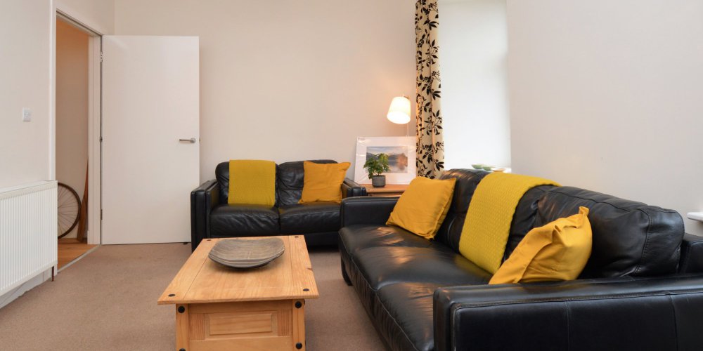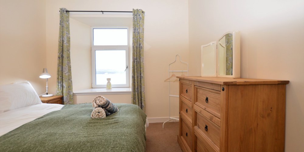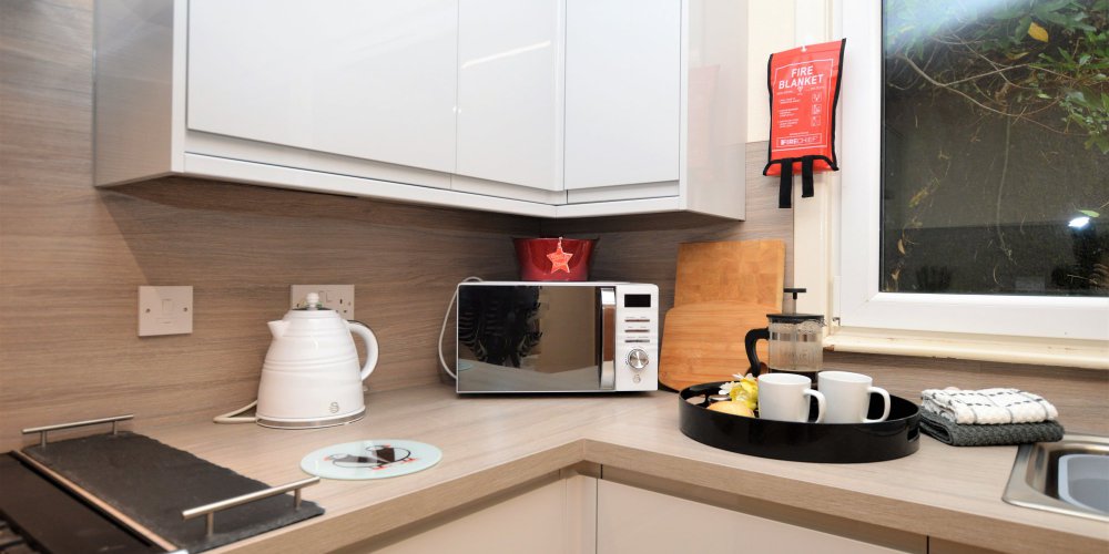 The spacious living room features comfortable sofas, central heating and large window views to maximise the breath-taking sea views. A lovely room to enjoy cosy nights in after a day exploring. For entertainment there is a Smart TV with Freeview and Wi-Fi.