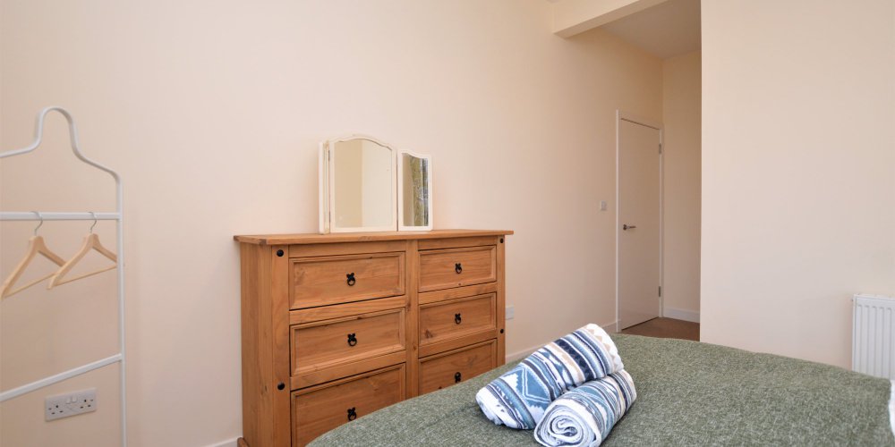 Bedroom 3: King-size bed or double, dresser, wall hangers, bedside table